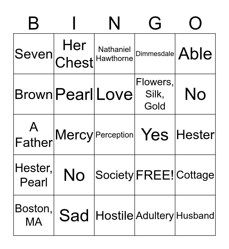 This bingo card has 25 words: No, Hostile, Love, Boston, MA, Able, Seven, Brown, Her Chest, Yes, Society, Flowers, Silk, Gold, A Father, FREE!, Cottage, Pearl, Husband, Hester, Nathaniel Hawthorne, No, Mercy, Perception, Sad, Hester, Pearl, Dimmesdale and Adultery.