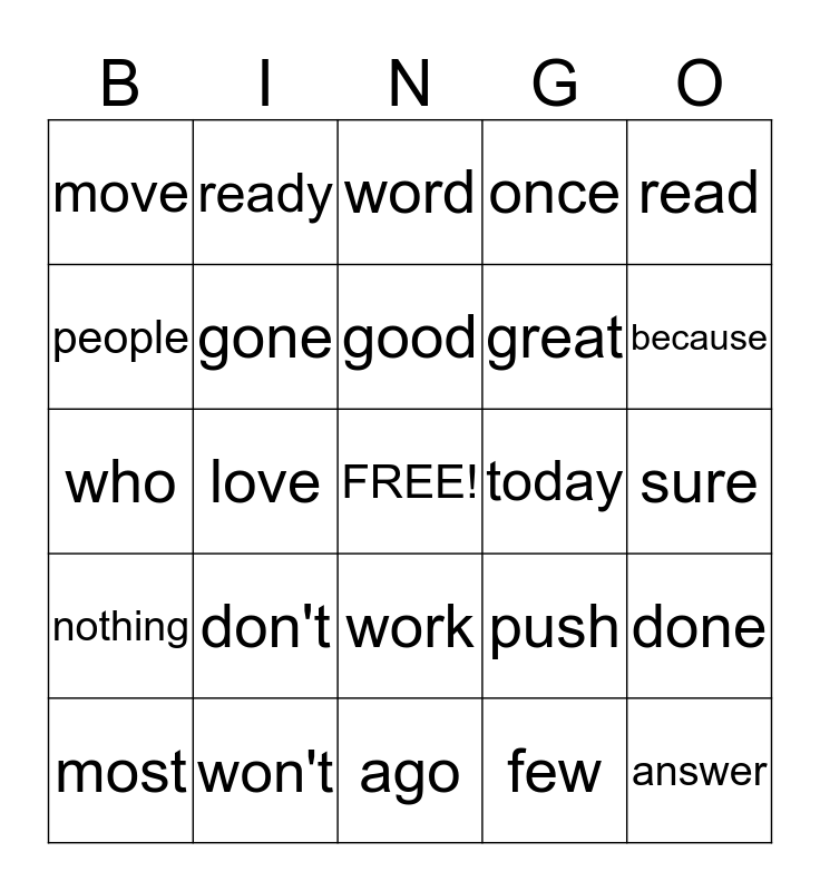 This bingo card has a free space and 24 words: don't, won't, good, most, read, move, people, ready, today, work, great, who, push, done, gone, few, sure, word, because, love, answer, nothing, once and ago.