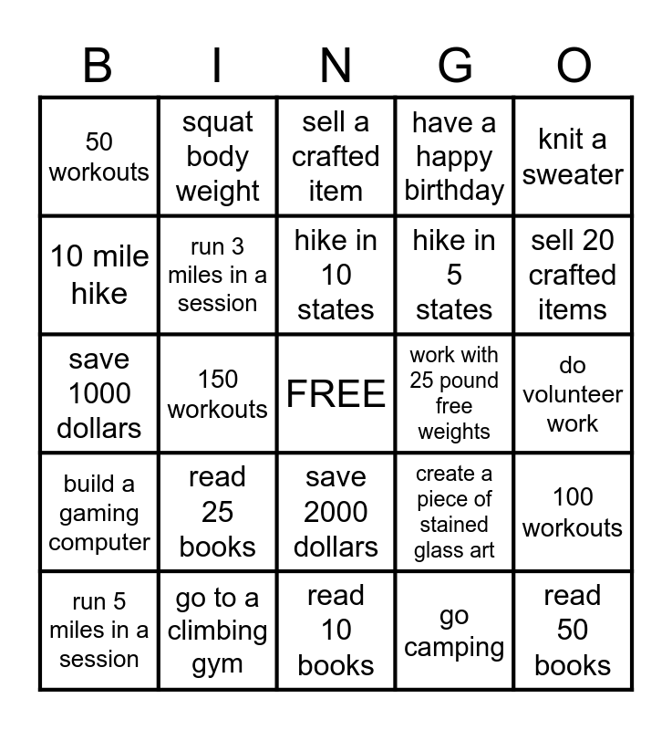 This bingo card has a free space and 24 words: run 5 miles in a session, read 25 books, hike in 10 states, go camping, knit a sweater, 50 workouts, squat body weight, sell a crafted item, work with 25 pound free weights, do volunteer work, save 1000 dollars, run 3 miles in a session, create a piece of stained glass art, 100 workouts, 10 mile hike, go to a climbing gym, read 10 books, have a happy birthday, sell 20 crafted items, build a gaming computer, 150 workouts, save 2000 dollars, hike in 5 states and read 50 books.