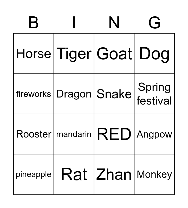 This bingo card has 22 words: Rat, Ox, Tiger, Rabbit, Dragon, Snake, Horse, Goat, RED, Monkey, Rooster, Dog, Pig, Xin, Zhan, Smiley the Squirrel, Angpow, pineapple, mandarin, fireworks, Spring festival and Gong xi fa cai.