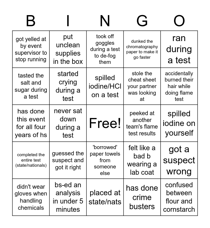 This bingo card has a free space and 24 words: guessed the suspect and got it right, bs-ed an analysis in under 5 minutes, spilled iodine/HCl on a test, didn't wear gloves when handling chemicals, ran during a test, got yelled at by event supervisor to stop running, tasted the salt and sugar during a test, put unclean supplies in the box, peeked at another team's flame test results, 'borrowed' paper towels from someone else, stole the cheat sheet your partner was looking at, has done this event for all four years of hs, felt like a bad b wearing a lab coat, got a suspect wrong, started crying during a test, has done crime busters, spilled iodine on yourself, took off goggles during a test to de-fog them, accidentally burned their hair while doing flame test, never sat down during a test, confused between flour and cornstarch, completed the entire test (state/nationals), dunked the chromatography paper to make it go faster and placed at state/nats.