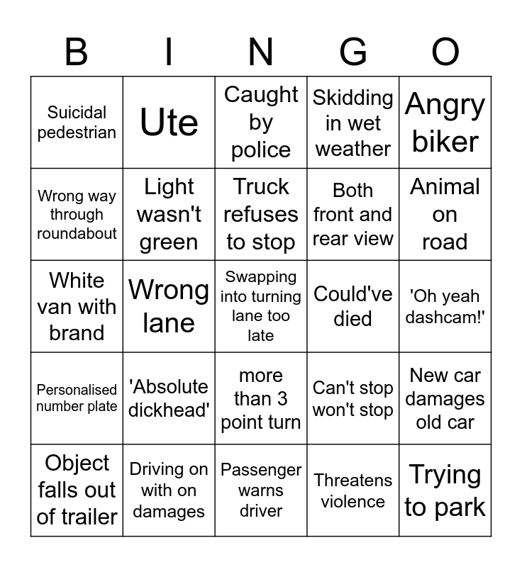This bingo card has 25 words: 'Absolute dickhead', Passenger warns driver, Truck refuses to stop, Object falls out of trailer, Angry biker, Suicidal pedestrian, Wrong way through roundabout, Ute, Could've died, more than 3 point turn, Both front and rear view, White van with brand, Can't stop won't stop, New car damages old car, Light wasn't green, Trying to park, 'Oh yeah dashcam!', Caught by police, Animal on road, Wrong lane, Swapping into turning lane too late, Driving on with on damages, Personalised number plate, Skidding in wet weather and Threatens violence.