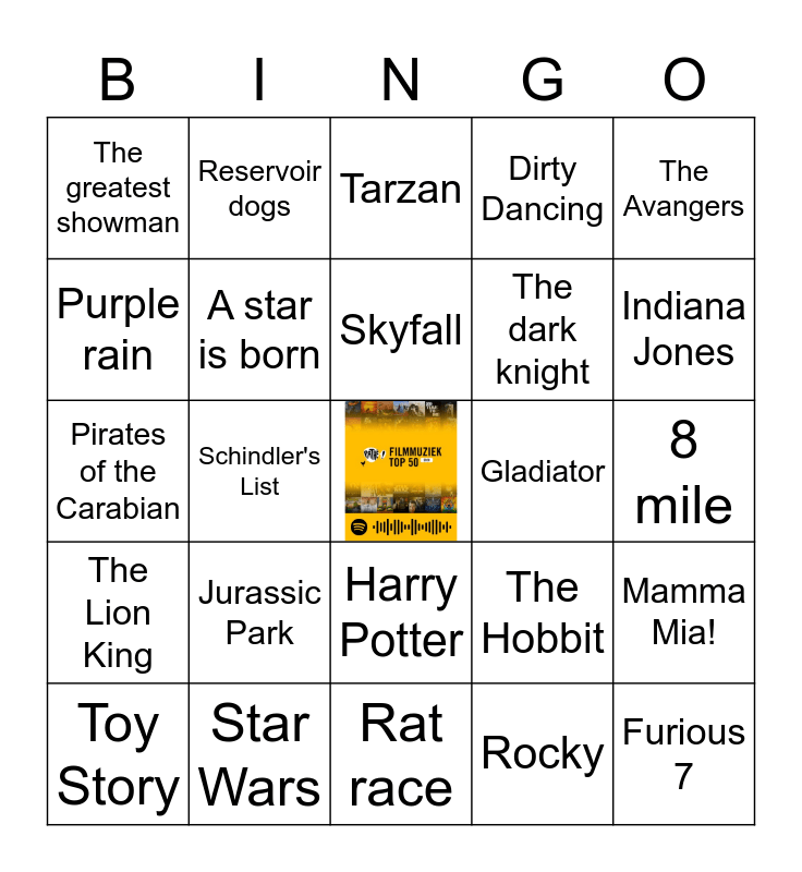 This bingo card has a free space and 40 words: Mission Impossible, Pirates of the Carabian, Bohemian Rhapsody, A star is born, Star Wars, Harry Potter, Skyfall, Inception, The Avangers, The Lion King, Schindler's List, Dirty Dancing, Furious 7, 8 mile, Gladiator, Jurassic Park, Grease, The greatest showman, The breakfast-club, Tarzan, Mamma Mia!, Rocky, The dark knight, Purple rain, Frozen, Interstellar, The bodyguard, The lord of the rings, Guardians of the galaxy, No time to die, Intouchable, Toy Story, Thor: Ragnarok, The Hobbit, Indiana Jones, Rat race, Vaiana, Spider man, Reservoir dogs and Titanic.