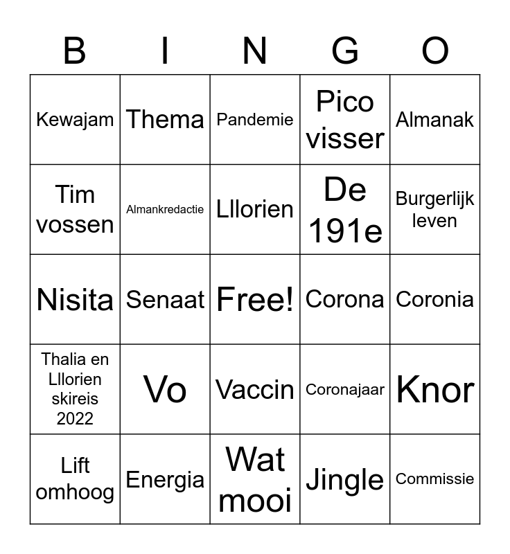 This bingo card has a free space and 25 words: Vo, Wat mooi, Lllorien, Lift omhoog, Almanak, Kewajam, Tim vossen, Thema, Corona, Vaccin, De 191e, Nisita, Coronajaar, Knor, Almankredactie, Nia, Coronia, Pandemie, Burgerlijk leven, Senaat, Commissie, Energia, Thalia en Lllorien skireis 2022, Pico visser and Jingle.