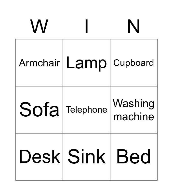 This bingo card has 12 words: Dishwasher, Bed, Telephone, Washing machine, Lamp, Cupboard, Sink, Fridge, Armchair, Sofa, Desk and Cooker.