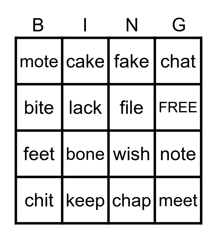 This bingo card has 32 words: sleep, bake, note, reef, meet, file, bite, site, cake, make, FREE, fake, gave, wave, keep, lake, mush, wish, cash, mash, dash, kite, chap, church, chit, chat, feet, lack, mote, pile, pole and bone.
