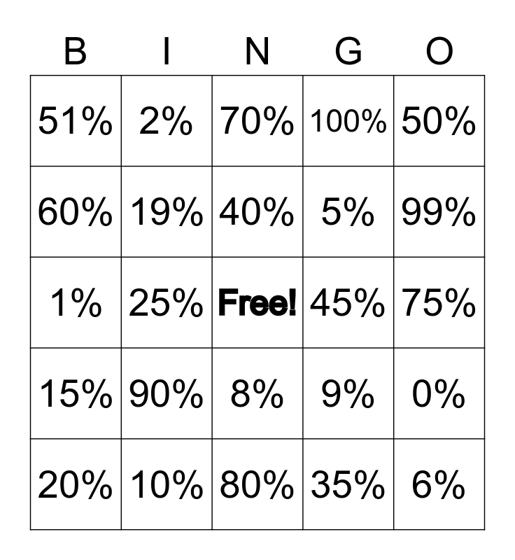 This bingo card has a free space and 24 words: 90%, 10%, 40%, 20%, 50%, 51%, 60%, 2%, 45%, 8%, 5%, 1%, 9%, 0%, 19%, 35%, 75%, 70%, 99%, 25%, 6%, 15%, 100% and 80%.