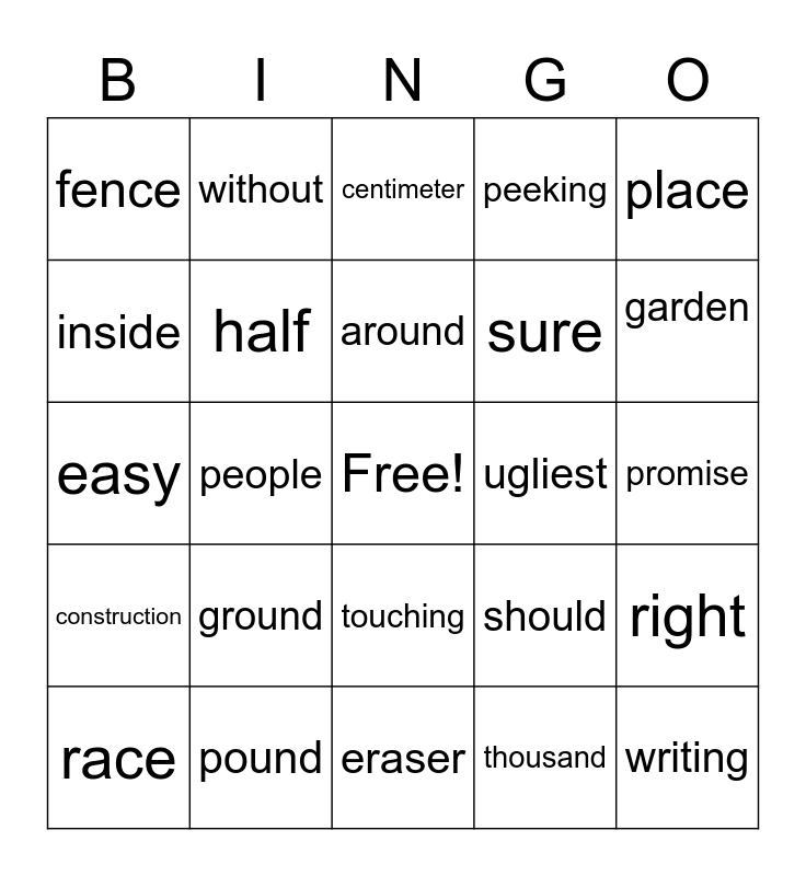 This bingo card has a free space and 24 words: ground, pound, around, race, place, fence, inside, without, ugliest, touching, sure, easy, should, right, half, thousand, promise, centimeter, garden, people, writing, construction, peeking and eraser.