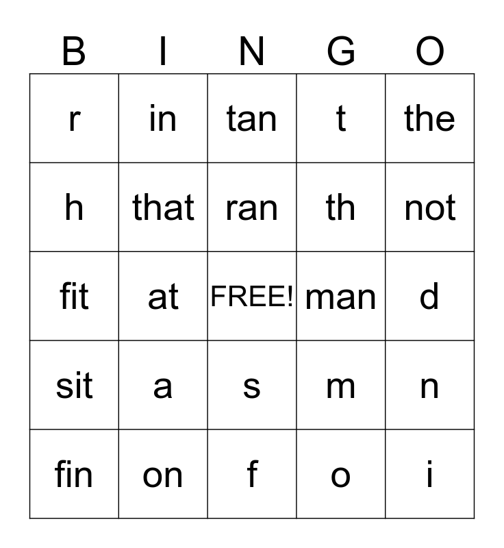 This bingo card has a free space and 33 words: this, is, at, dim, sit, that, the, fin, in, an, ran, tan, cat, can, man, not, on, fit, a, m, s, e, r, d, f, i, t, th, h, n, c, o and u.