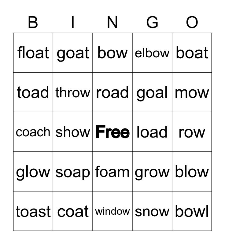 This bingo card has a free space and 24 words: soap, coat, road, toast, boat, float, toad, goat, load, foam, goal, coach, grow, blow, throw, snow, row, bow, mow, show, bowl, glow, elbow and window.