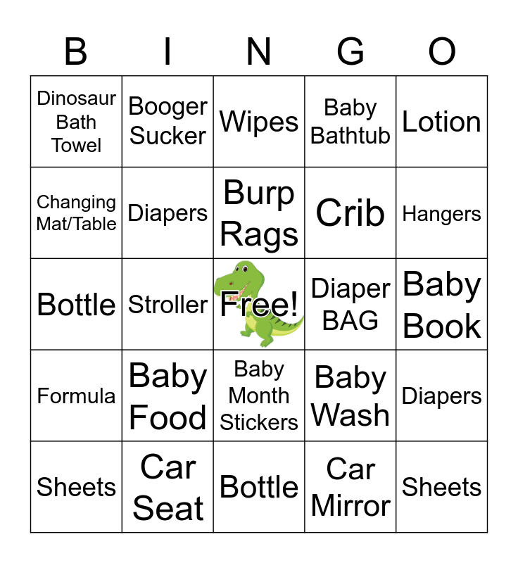 This bingo card has a free space and 24 words: Baby Food, Car Seat, Burp Rags, Sheets, Lotion, Dinosaur Bath Towel, Changing Mat/Table, Booger Sucker, Diaper BAG, Baby Month Stickers, Crib, Bottle, Baby Wash, Diapers, Diapers, Car Mirror, Baby Book, Wipes, Hangers, Stroller, Sheets, Formula, Baby Bathtub and Bottle.