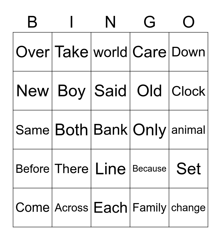 This bingo card has 25 words: There, Each, Said, Come, Down, Over, New, Take, Only, Line, Old, Same, Because, Set, Boy, change, animal, world, Clock, Both, Bank, Across, Before, Care and Family.