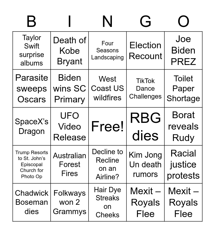 This bingo card has a free space and 53 words: Covid-19 vaccines, Mexit – Royals Flee, Covid-19 vaccines, Mexit – Royals Flee, Australian Forest Fires, Murder Hornets, Death of Kobe Bryant, Trump Impeachment, Parasite sweeps Oscars, Harvey Weinstein verdict, Biden wins SC Primary, Stock market crash 2020, Racial justice protests, Kim Jong Un death rumors, Kamala Harris chosen as VP candidate, Chadwick Boseman dies, West Coast US wildfires, RBG dies, Trump gets COVID-19, Joe Biden PREZ, UFO Video Release, March Madness Canceled, TikTok Dance Challenges, Taylor Swift surprise albums, NBA Bubble, Folkways won 2 Grammys, Baby Yoda emerged, Mr. Peanut died & was reborn, Hamilton: The Movie, Toilet Paper Shortage, Black is King (BEYONCE), Clorox wipes, TikTok users troll Trump rally, Zodiac Killer Message decrypted, Confederate Statues tumble, Washington Football Team, Election Recount, Hair Dye Streaks on Cheeks, Four Seasons Landscaping, Needs 11,870 Votes added, Georgia On My Mind, Downfall of Ellen, Borat reveals Rudy, Votes from Dead People, Shredding the State of the Union Speech, Decline to Recline on an Airline?, Have you Heard about Herd Immunity?, Hydroxychloroquine, SpaceX’s Dragon, Trump Resorts to St. John’s Episcopal Church for Photo Op, Kanye West’s Run for President, Ballot Drop Boxes and The Fly That Took Over the Debate.