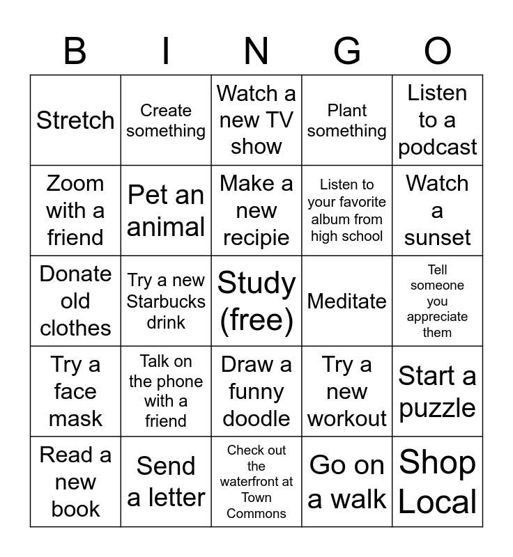 This bingo card has a free space and 24 words: Talk on the phone with a friend, Send a letter, Make a new recipie, Read a new book, Listen to a podcast, Stretch, Zoom with a friend, Create something, Meditate, Draw a funny doodle, Listen to your favorite album from high school, Donate old clothes, Try a new workout, Start a puzzle, Pet an animal, Go on a walk, Tell someone you appreciate them, Watch a new TV show, Watch a sunset, Try a new Starbucks drink, Shop Local, Try a face mask, Plant something and Check out the waterfront at Town Commons.