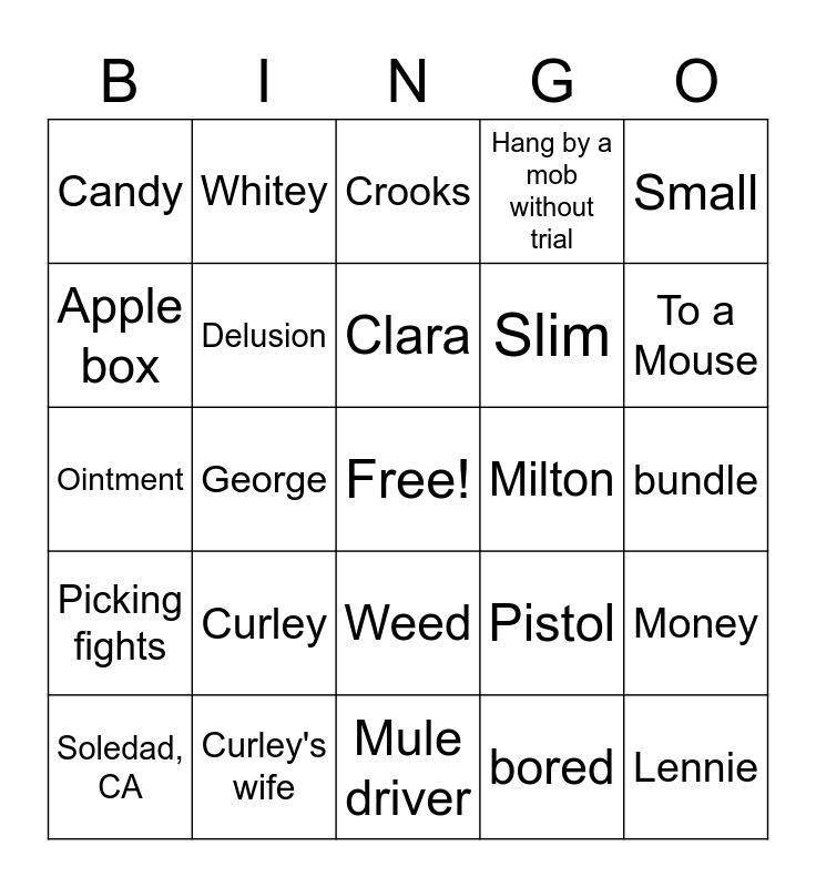 This bingo card has a free space and 24 words: Curley, Curley's wife, Clara, Soledad, CA, Small, Candy, Apple box, Whitey, Milton, Weed, Slim, Ointment, Pistol, Money, Delusion, bored, bundle, Crooks, To a Mouse, George, Lennie, Picking fights, Hang by a mob without trial and Mule driver.