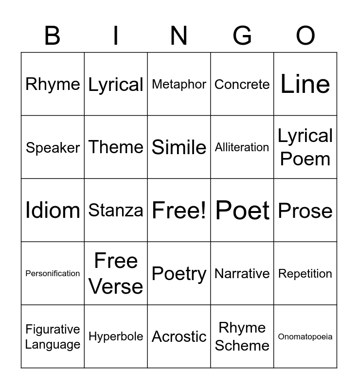 This bingo card has a free space and 24 words: Free Verse, Hyperbole, Simile, Figurative Language, Line, Rhyme, Speaker, Lyrical, Poet, Poetry, Alliteration, Idiom, Narrative, Repetition, Theme, Rhyme Scheme, Prose, Metaphor, Lyrical Poem, Stanza, Onomatopoeia, Personification, Concrete and Acrostic.