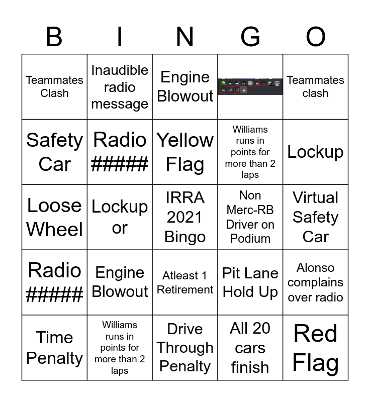 This bingo card has 1 images, a free space and 37 words: Red Flag, Virtual Safety Car, Safety Car, Radio #####, Alonso complains over radio, Engine Blowout, Yellow Flag, Non Merc-RB driver on Podium, Teammates clash, Williams runs in points for more than 2 laps, Lockup or, Red Flag, Virtual Safety Car, Safety Car, Radio #####, Alonso complains over the radio, Engine Blowout, Yellow Flag, Non Merc-RB Driver on Podium, Teammates Clash, Williams runs in points for more than 2 laps, Lockup, Time Penalty, Someone forced off the track, Drive Through Penalty, Long Pitstop (4+ seconds), Someone crashes on their own, Lap 1 Crash, 3+ Drivers Retired, 2+ Drivers Retired, Atleast 1 Retirement, All 20 cars finish, Inaudible radio message, TV Camera looks at Christian Horner pre-race, Pit Lane Hold Up, Loose Wheel and Someone completes a 2 stop.