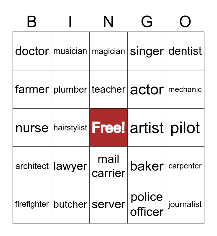 This bingo card has a free space and 24 words: lawyer, butcher, teacher, firefighter, dentist, doctor, farmer, musician, artist, mail carrier, actor, nurse, baker, carpenter, plumber, police officer, pilot, magician, mechanic, hairstylist, journalist, architect, singer and server.