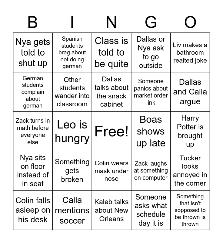 This bingo card has a free space and 24 words: Something gets broken, Calla mentions soccer, Dallas talks about the snack cabinet, Colin falls asleep on his desk, Liv makes a bathroom realted joke, Nya gets told to shut up, German students complain about german, Spanish students brag about not doing german, Boas shows up late, Colin wears mask under nose, Someone panics about market order link, Zack turns in math before everyone else, Zack laughs at something on computer, Tucker looks annoyed in the corner, Other students wander into classroom, Someone asks what schedule day it is, Harry Potter is brought up, Class is told to be quite, Dallas and Calla argue, Leo is hungry, Something that isn't sopposed to be thrown is thrown, Nya sits on floor instead of in seat, Dallas or Nya ask to go outside and Kaleb talks about New Orleans.