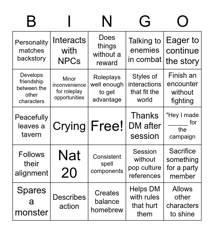 This bingo card has a free space and 24 words: Nat 20, Describes action, Roleplays well enough to get advantage, Spares a monster, Eager to continue the story, Personality matches backstory, Develops friendship between the other characters, Interacts with NPCs, Thanks DM after session, Consistent spell components, Styles of interactions that fit the world, Peacefully leaves a tavern, Session without pop culture references, Sacrifice something for a party member, Minor inconvenience for roleplay opportunities, Helps DM with rules that hurt them, "Hey I made ______ for the campaign, Does things without a reward, Finish an encounter without fighting, Crying, Allows other characters to shine, Follows their alignment, Talking to enemies in combat and Creates balance homebrew.