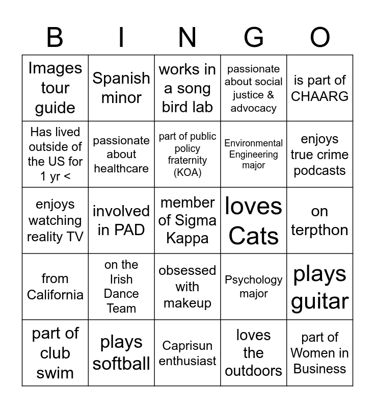 This bingo card has a free space and 24 words: on the Irish Dance Team, plays softball, part of public policy fraternity (KOA), part of club swim, is part of CHAARG, Images tour guide, Has lived outside of the US for 1 yr <, Spanish minor, loves Cats, obsessed with makeup, Environmental Engineering major, enjoys watching reality TV, Psychology major, plays guitar, passionate about healthcare, loves the outdoors, on terpthon, works in a song bird lab, enjoys true crime podcasts, involved in PAD, part of Women in Business, from California, passionate about social justice & advocacy and Caprisun enthusiast.