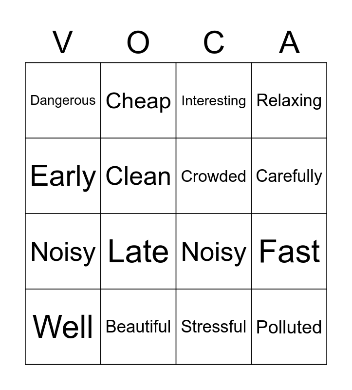 This bingo card has 22 words: Beautiful, Boring, Cheap, Expensive, Clean, Crowded, Dangerous, Interesting, Noisy, Polluted, Noisy, Relaxing, Safe, Spacious, Stressful, Ugly, Fast, Well, Late, Early, Carefully and Patiently.