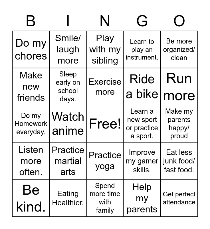 This bingo card has a free space and 42 words: Improve my math skills, Exercise more, Focus more, Practice martial arts, Help my parents, Eat less junk food/ fast food., Get perfect attendance, Check/ review my homework, Play with my sibling, Practice yoga, Make my parents happy/ proud, Run more, Watch anime, Be more organized/ clean, Spend more time outdoors., Improve my gamer skills., Learn how to cook, Do my Homework everyday., Read more, Smile/ laugh more, Make new friends, Be kind, Become a better artist., Do my chores, Love more, Dance, Ride a bike, Be a better writer, Spend less time watching tv, Spend less time playing video games, Listen to music more., Listen more often., Sleep early on school days., Spend more time with family, Learn how to skate., Be kind., Eating Healthier., Learn a new sport or practice a sport., Be punctual/ be on time to class., Participate in class., Learn to play an instrument. and Improve my writing skills.