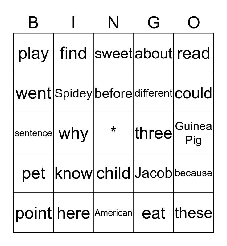 This bingo card has a free space and 24 words: know, here, before, point, read, play, went, find, three, child, different, sentence, Jacob, because, Spidey, eat, Guinea Pig, sweet, could, why, these, pet, about and American.