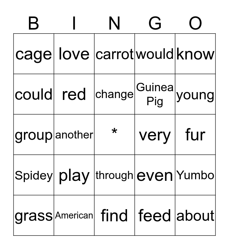 This bingo card has a free space and 24 words: play, American, change, grass, know, cage, could, love, very, through, Guinea Pig, group, even, Yumbo, red, feed, fur, carrot, young, another, about, Spidey, would and find.