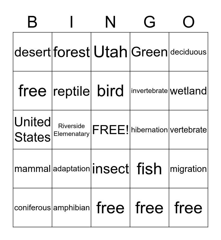 This bingo card has a free space and 24 words: adaptation, amphibian, bird, coniferous, deciduous, desert, free, forest, hibernation, insect, invertebrate, United States, fish, migration, reptile, free, vertebrate, Utah, wetland, Riverside Elemenatary, free, mammal, Green and free.