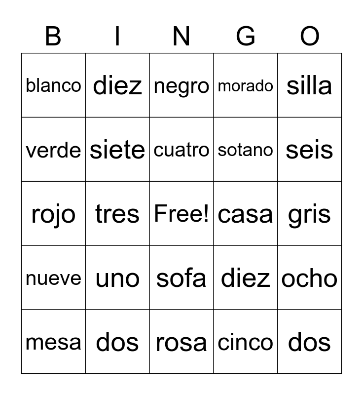 This bingo card has a free space and 24 words: uno, dos, cuatro, mesa, silla, blanco, verde, diez, casa, sofa, sotano, rojo, diez, ocho, siete, cinco, gris, negro, seis, tres, dos, nueve, morado and rosa.