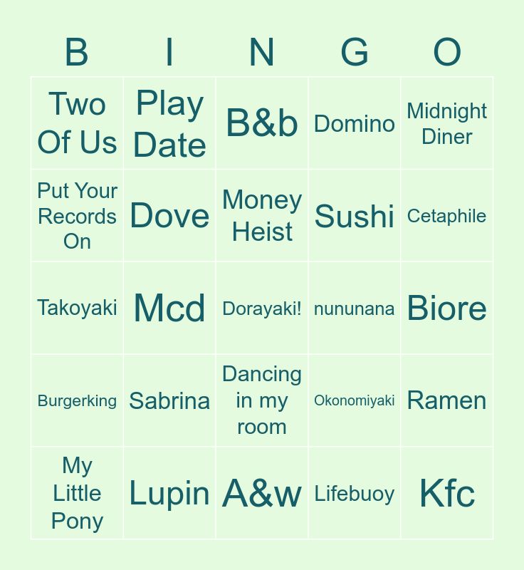 This bingo card has a free space and 24 words: Sabrina, Lupin, Money Heist, My Little Pony, Midnight Diner, Two Of Us, Put Your Records On, Play Date, nununana, Dancing in my room, Sushi, Takoyaki, Okonomiyaki, Ramen, Dove, Lifebuoy, Biore, B&b, Cetaphile, Mcd, Kfc, Burgerking, Domino and A&w.