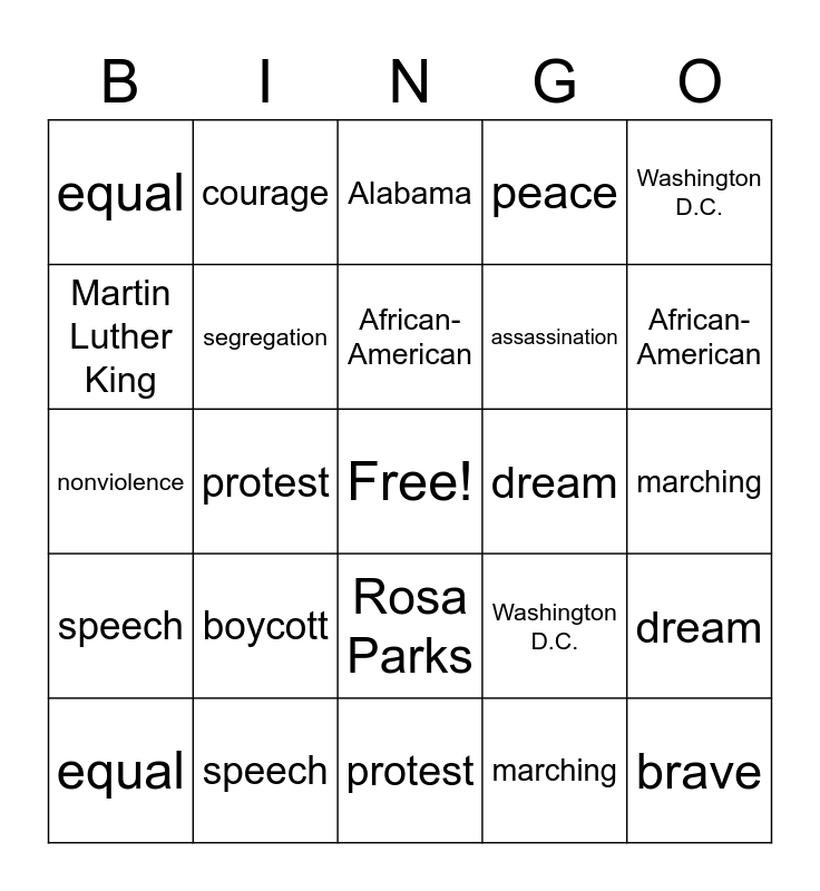 This bingo card has a free space and 45 words: courage, brave, freedom, equal, rights, marching, Alabama, Tennessee, Washington D.C., speech, peace, dream, Rosa Parks, boycott, leader, protest, justice, nonviolence, minister, African-American, courage, brave, freedom, equal, rights, marching, Alabama, Tennessee, Washington D.C., speech, peace, dream, Rosa Parks, boycott, leader, protest, justice, nonviolence, minister, African-American, Martin Luther King, assassination, Atlanta, segregation and change.
