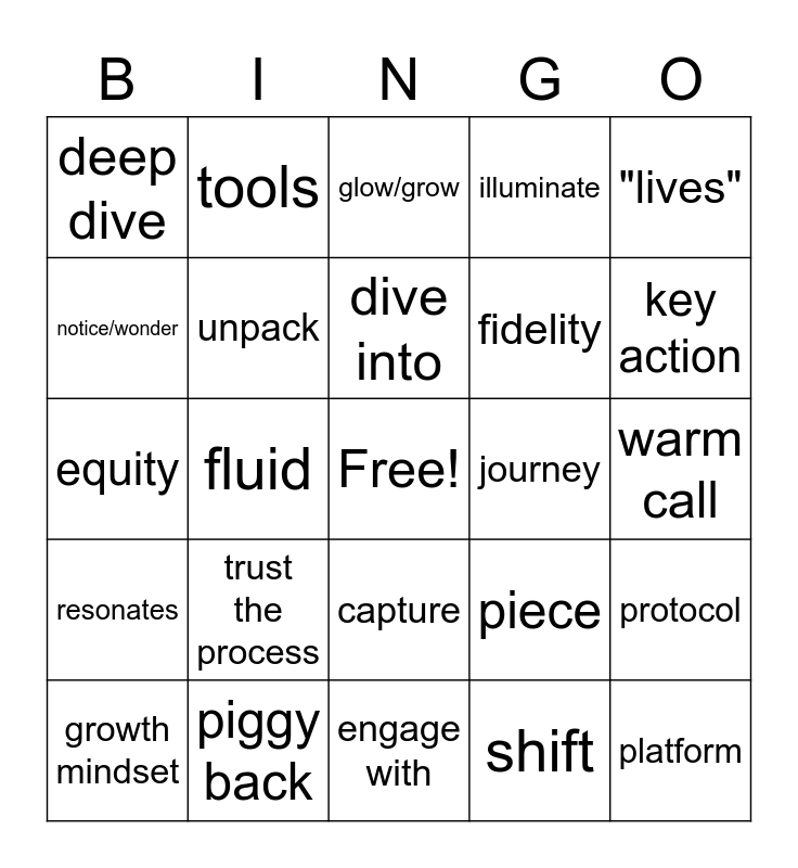 This bingo card has a free space and 24 words: trust the process, piggy back, dive into, growth mindset, "lives", deep dive, notice/wonder, tools, journey, capture, fidelity, equity, piece, protocol, unpack, shift, warm call, glow/grow, key action, fluid, platform, resonates, illuminate and engage with.