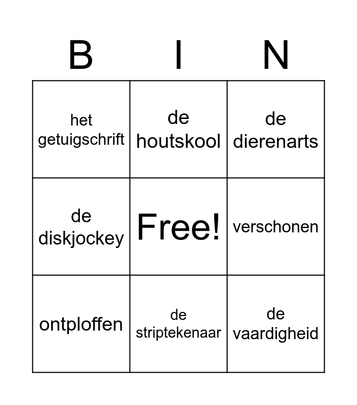 This bingo card has a free space and 20 words: de verpleegkundige, de fysiotherapeut, de dierenarts, de imker, de geitenfokker, de vaardigheid, de professional, het getuigschrift, het waskrijt, de houtskool, deskundig, legen, verschonen, de winst, ontploffen, de fopwinkel, de striptekenaar, de diskjockey, de sluiswachter and ergens aan toe komen.