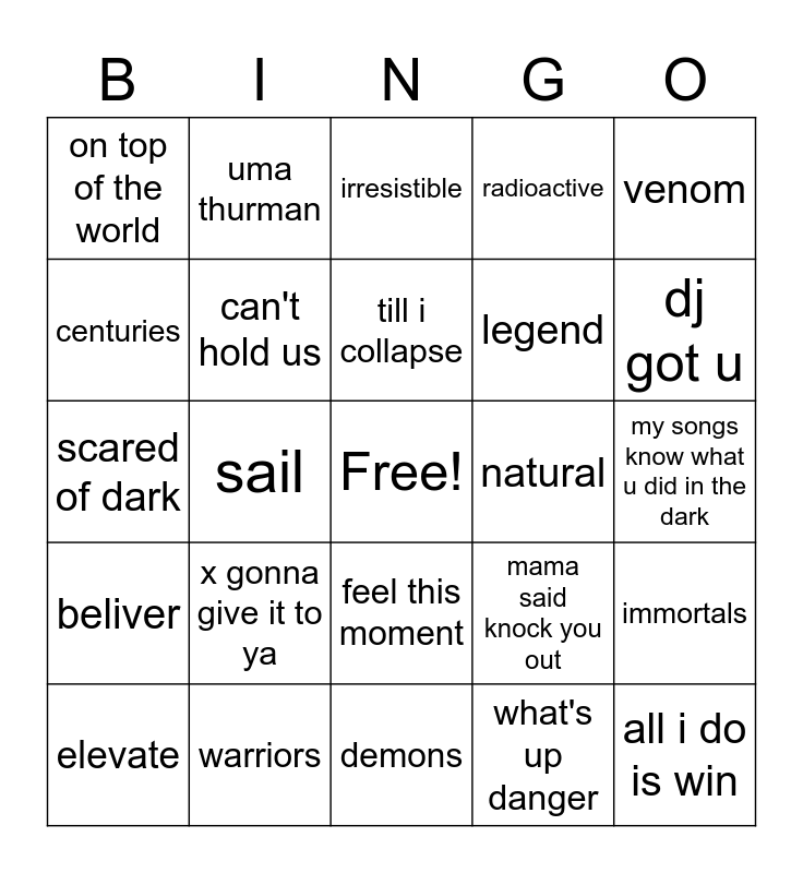 This bingo card has a free space and 28 words: immortals, unstoppable, legend, what's up danger, centuries, irresistible, uma thurman, beliver, natural, elevate, scared of dark, radioactive, warriors, demons, dj got u, where the hood at, x gonna give it to ya, can't hold us, till i collapse, feel this moment, on top of the world, lose yourself, all i do is win, sail, my songs know what u did in the dark, mama said knock you out, venom and still dre.