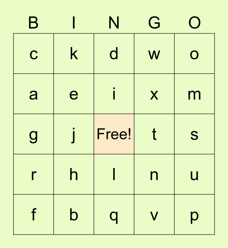 This bingo card has a free space and 24 words: h, b, i, f, o, c, a, k, t, l, x, g, n, u, e, v, s, d, m, j, p, r, w and q.