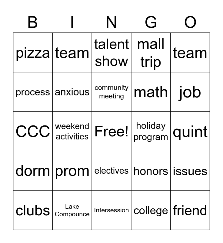 This bingo card has a free space and 29 words: clubs, life sports, weekend activities, dining hall, pizza, talent show, anxious, prom, holiday program, Lake Compounce, quint, friend, Intersession, college, job, boyfriend/ girlfriend, electives, dorm, team, CCC, honors, I&C, math, process, mall trip, team, issues, community meeting and Incident Report.