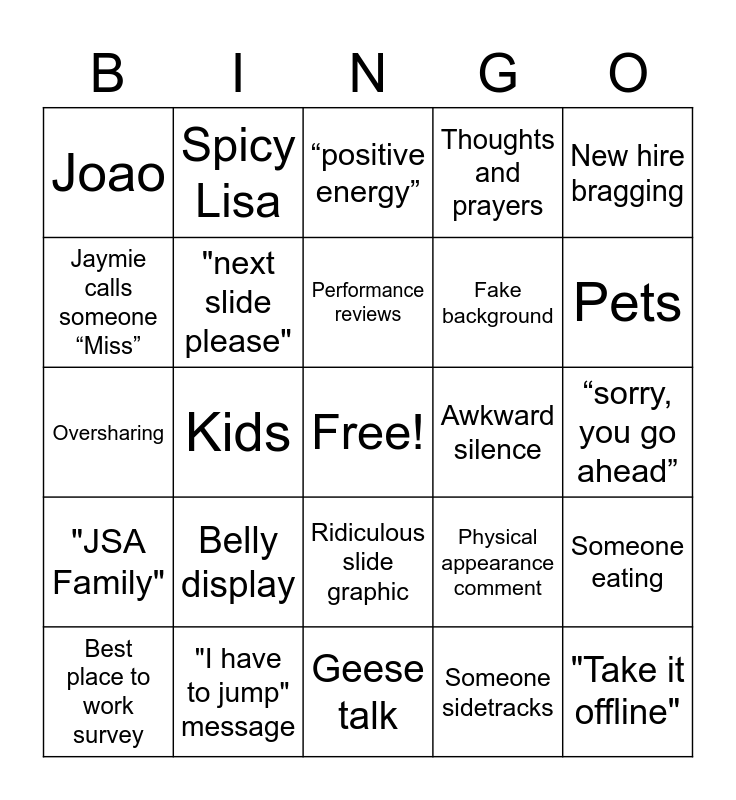 This bingo card has a free space and 25 words: Belly display, Geese talk, Performance reviews, Best place to work survey, New hire bragging, Joao, Jaymie calls someone “Miss”, Spicy Lisa, Awkward silence, Ridiculous slide graphic, Fake background, Oversharing, Physical appearance comment, Someone eating, "next slide please", "send it around", “sorry, you go ahead”, “positive energy”, Pets, Kids, "Take it offline", "I have to jump" message, "JSA Family", Thoughts and prayers and Someone sidetracks.
