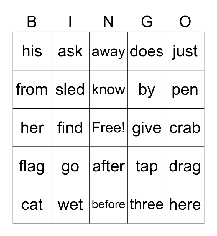 This bingo card has a free space and 24 words: go, wet, know, cat, just, his, from, ask, give, after, by, her, tap, drag, sled, three, crab, away, pen, find, here, flag, does and before.
