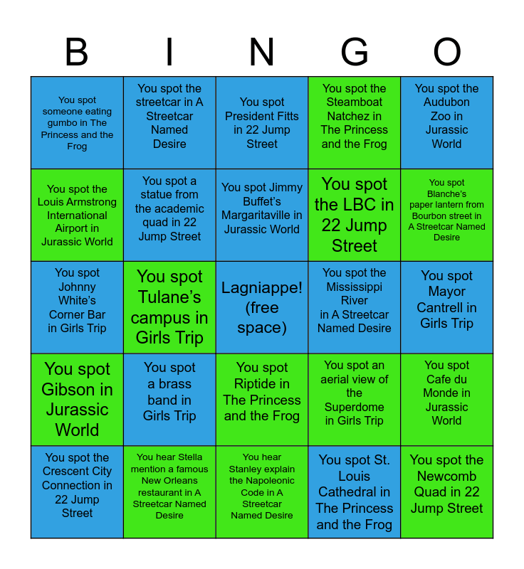This bingo card has a free space and 24 words: You spot the Crescent City Connection in 22 Jump Street, You spot a brass band in Girls Trip, You spot Jimmy Buffet’s Margaritaville in Jurassic World, You spot St. Louis Cathedral in The Princess and the Frog, You spot the Audubon Zoo in Jurassic World, You spot someone eating gumbo in The Princess and the Frog, You spot the streetcar in A Streetcar Named Desire, You spot President Fitts in 22 Jump Street, You spot the Mississippi River in A Streetcar Named Desire, You spot Mayor Cantrell in Girls Trip, You spot Johnny White’s Corner Bar in Girls Trip, You spot a statue from the academic quad in 22 Jump Street, You spot an aerial view of the Superdome in Girls Trip, You spot Cafe du Monde in Jurassic World, You spot the Louis Armstrong International Airport in Jurassic World, You hear Stella mention a famous New Orleans restaurant in A Streetcar Named Desire, You hear Stanley explain the Napoleonic Code in A Streetcar Named Desire, You spot the Steamboat Natchez in The Princess and the Frog, You spot Blanche’s paper lantern from Bourbon street in A Streetcar Named Desire, You spot Gibson in Jurassic World, You spot Tulane’s campus in Girls Trip, You spot Riptide in The Princess and the Frog, You spot the LBC in 22 Jump Street and You spot the Newcomb Quad in 22 Jump Street.