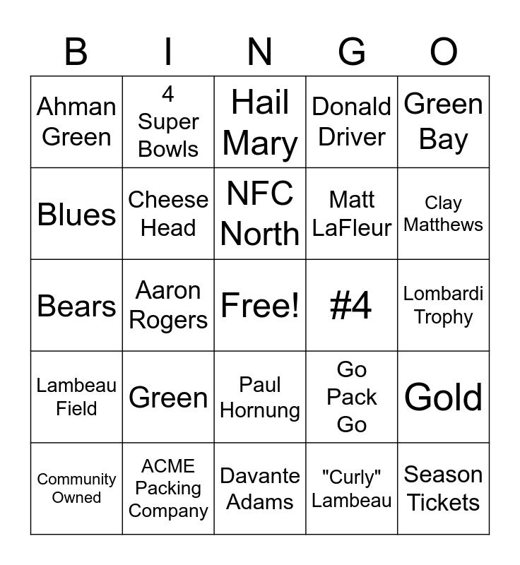 This bingo card has a free space and 24 words: Green, ACME Packing Company, NFC North, Community Owned, Green Bay, Ahman Green, Blues, 4 Super Bowls, #4, Paul Hornung, Matt LaFleur, Bears, Go Pack Go, Gold, Cheese Head, "Curly" Lambeau, Lombardi Trophy, Hail Mary, Clay Matthews, Aaron Rogers, Season Tickets, Lambeau Field, Donald Driver and Davante Adams.