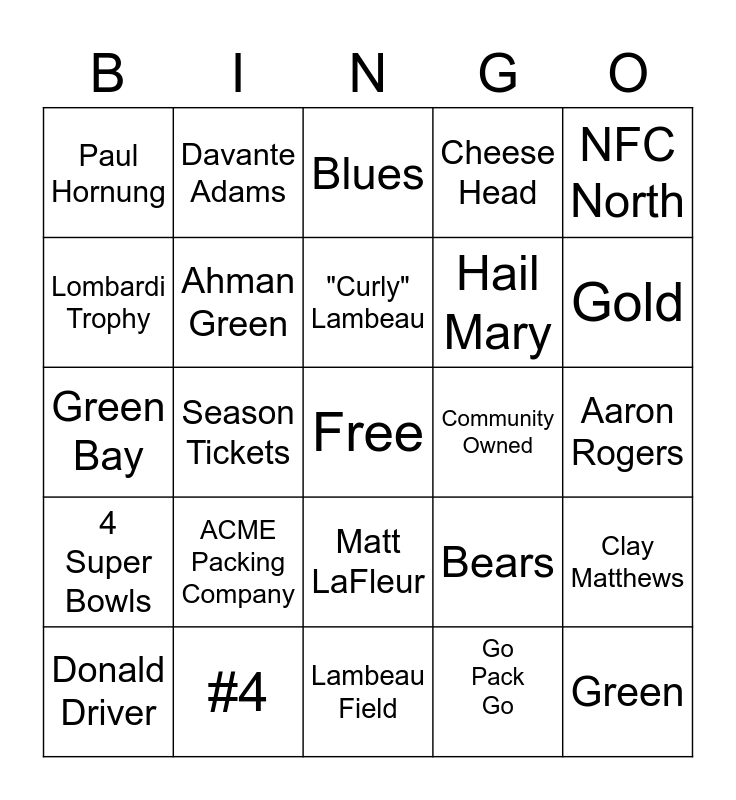 This bingo card has a free space and 24 words: ACME Packing Company, #4, "Curly" Lambeau, Donald Driver, NFC North, Paul Hornung, Lombardi Trophy, Davante Adams, Community Owned, Matt LaFleur, Hail Mary, Green Bay, Bears, Clay Matthews, Ahman Green, Go Pack Go, Aaron Rogers, Blues, Gold, Season Tickets, Green, 4 Super Bowls, Cheese Head and Lambeau Field.