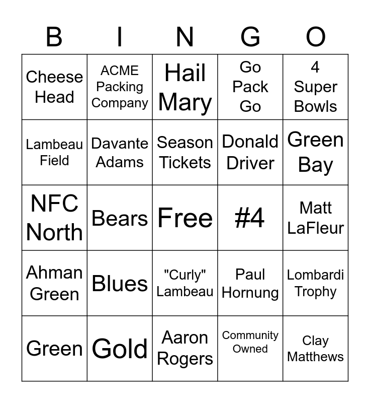 This bingo card has a free space and 24 words: Blues, Gold, Season Tickets, Green, 4 Super Bowls, Cheese Head, Lambeau Field, ACME Packing Company, #4, "Curly" Lambeau, Donald Driver, NFC North, Paul Hornung, Lombardi Trophy, Davante Adams, Community Owned, Matt LaFleur, Hail Mary, Green Bay, Bears, Clay Matthews, Ahman Green, Go Pack Go and Aaron Rogers.