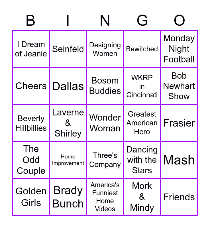 This bingo card has a free space and 35 words: Happy Days, Carol Burnett Show, Welcome Back Kotter, Dallas, Three's Company, Bewitched, Cheers, Little House on the Prairie, Bosom Buddies, Charlie's Angels, Beverly Hillbillies, Monday Night Football, Addams Family, Mary Tyler Moore, I Dream of Jeanie, Greatest American Hero, Mork & Mindy, Laverne & Shirley, The Odd Couple, Friends, Dancing with the Stars, Golden Girls, Mash, Brady Bunch, Designing Women, Bob Newhart Show, Growing Pains, I Love Lucy, WKRP in Cincinnati, Frasier, America's Got Talent, America's Funniest Home Videos, Home Improvement, Seinfeld and Magnum, P.I..