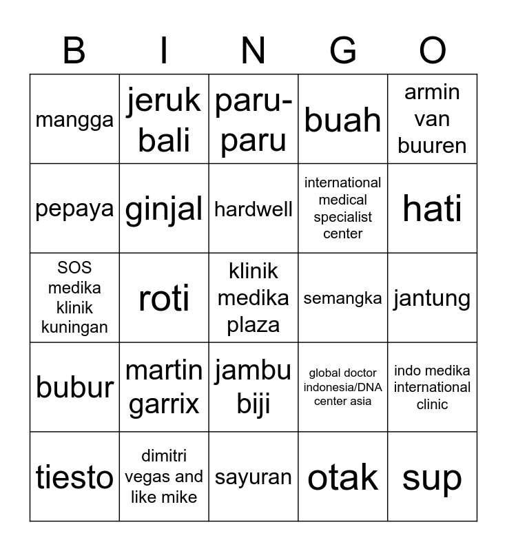 This bingo card has a free space and 24 words: martin garrix, dimitri vegas and like mike, hardwell, tiesto, armin van buuren, mangga, pepaya, jeruk bali, semangka, jambu biji, international medical specialist center, SOS medika klinik kuningan, global doctor indonesia/DNA center asia, indo medika international clinic, ginjal, otak, jantung, paru-paru, hati, roti, sup, bubur, buah and sayuran.