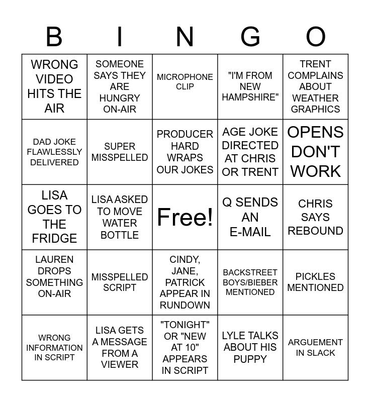 This bingo card has a free space and 24 words: MISSPELLED SCRIPT, LISA GETS A MESSAGE FROM A VIEWER, PRODUCER HARD WRAPS OUR JOKES, WRONG INFORMATION IN SCRIPT, TRENT COMPLAINS ABOUT WEATHER GRAPHICS, WRONG VIDEO HITS THE AIR, DAD JOKE FLAWLESSLY DELIVERED, SOMEONE SAYS THEY ARE HUNGRY ON-AIR, Q SENDS AN E-MAIL, CINDY, JANE, PATRICK APPEAR IN RUNDOWN, AGE JOKE DIRECTED AT CHRIS OR TRENT, LISA GOES TO THE FRIDGE, BACKSTREET BOYS/BIEBER MENTIONED, PICKLES MENTIONED, SUPER MISSPELLED, LYLE TALKS ABOUT HIS PUPPY, CHRIS SAYS REBOUND, MICROPHONE CLIP, OPENS DON'T WORK, LISA ASKED TO MOVE WATER BOTTLE, ARGUEMENT IN SLACK, LAUREN DROPS SOMETHING ON-AIR, "I'M FROM NEW HAMPSHIRE" and "TONIGHT" OR "NEW AT 10" APPEARS IN SCRIPT.