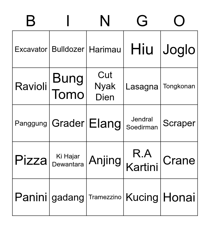 This bingo card has a free space and 24 words: Ki Hajar Dewantara, gadang, Cut Nyak Dien, Panini, Joglo, Excavator, Ravioli, Bulldozer, Jendral Soedirman, Anjing, Lasagna, Panggung, R.A Kartini, Crane, Bung Tomo, Kucing, Scraper, Harimau, Tongkonan, Grader, Honai, Pizza, Hiu and Tramezzino.