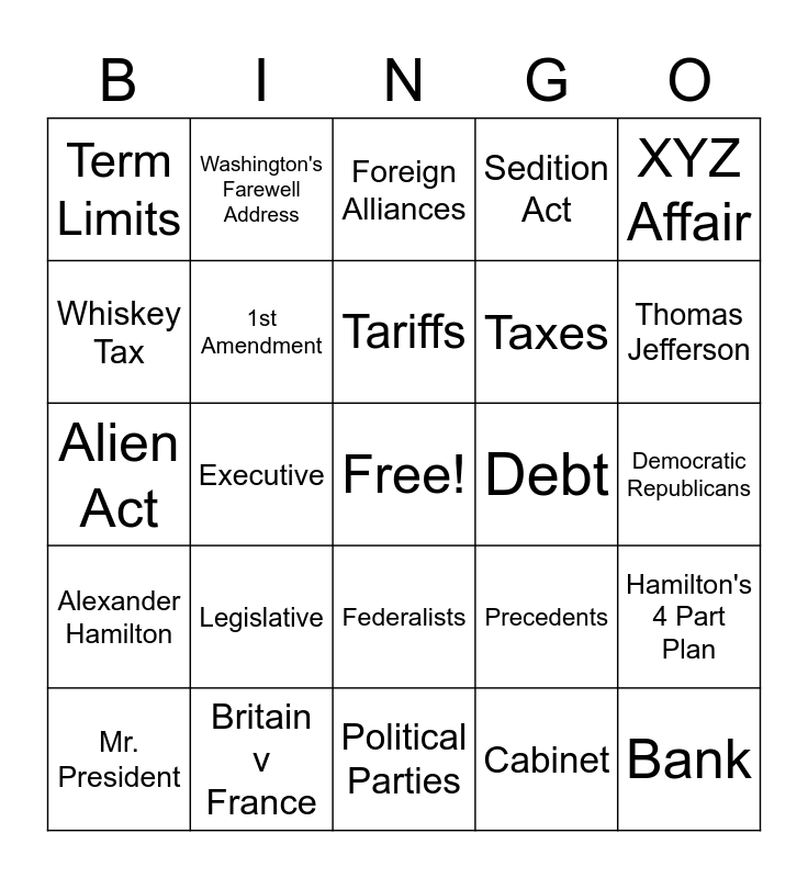 This bingo card has a free space and 26 words: Federalists, Cabinet, Tariffs, Britain v France, XYZ Affair, Term Limits, Whiskey Tax, Washington's Farewell Address, Democratic Republicans, Precedents, Taxes, Alien Act, Hamilton's 4 Part Plan, Mr. President, Executive, Proclamation of Neutrality, Sedition Act, Alexander Hamilton, Foreign Alliances, Bank, Thomas Jefferson, Political Parties, Debt, Legislative, 1st Amendment and Impressment.