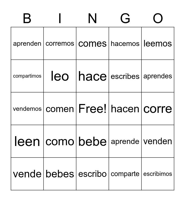 This bingo card has a free space and 24 words: como, bebes, hace, vende, leemos, aprenden, compartimos, corremos, hacen, bebe, escribes, vendemos, aprende, venden, leo, comparte, corre, comes, aprendes, comen, escribimos, leen, hacemos and escribo.